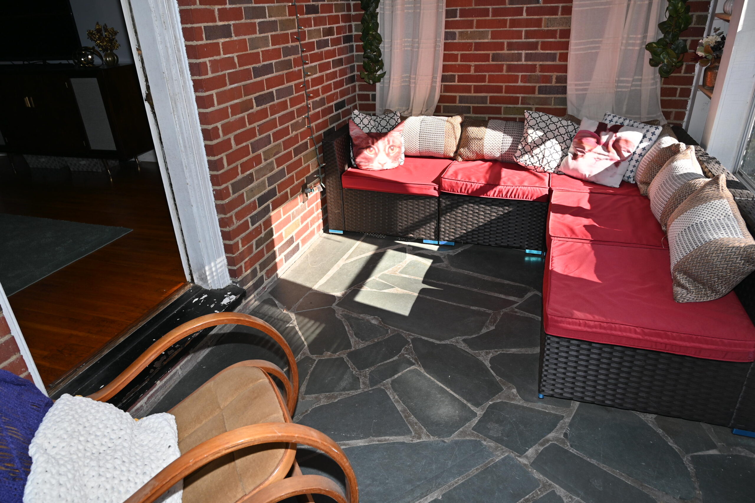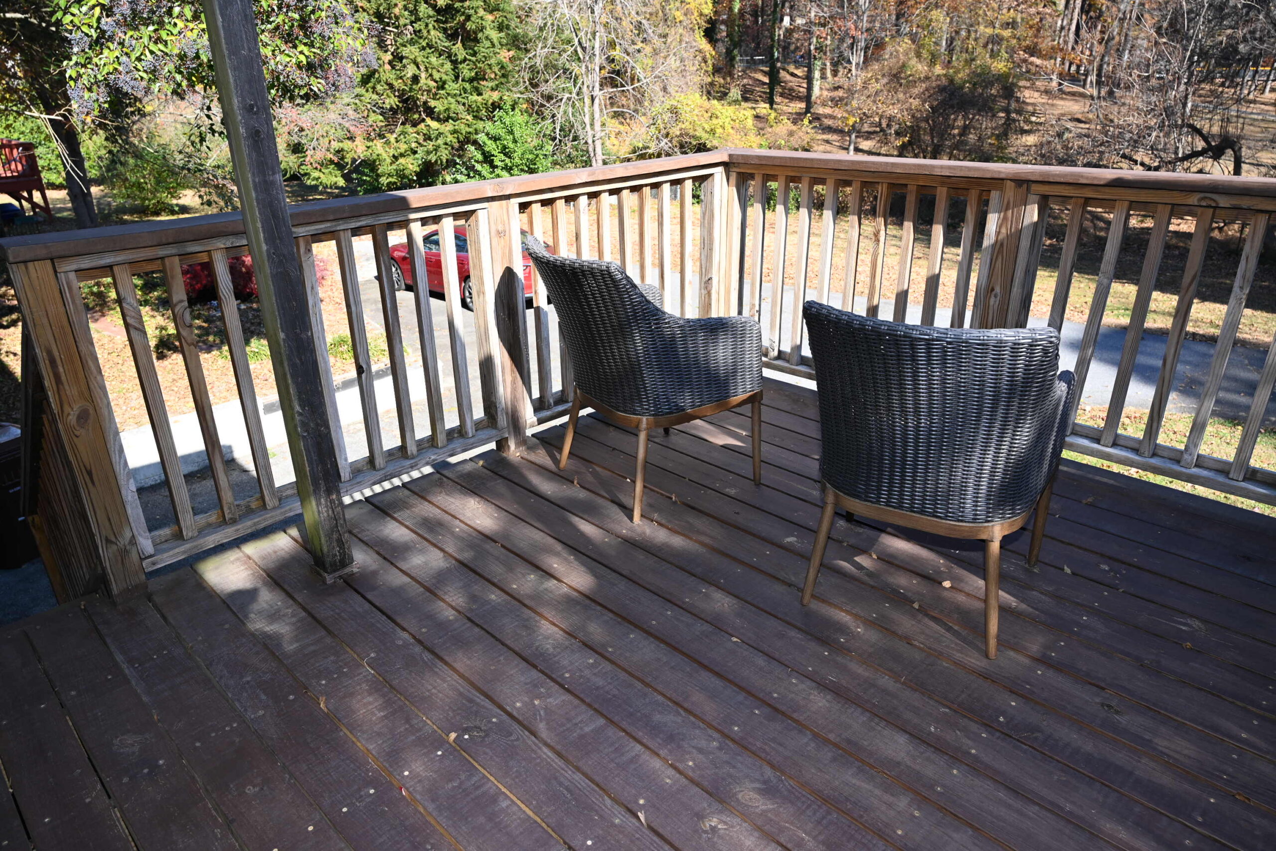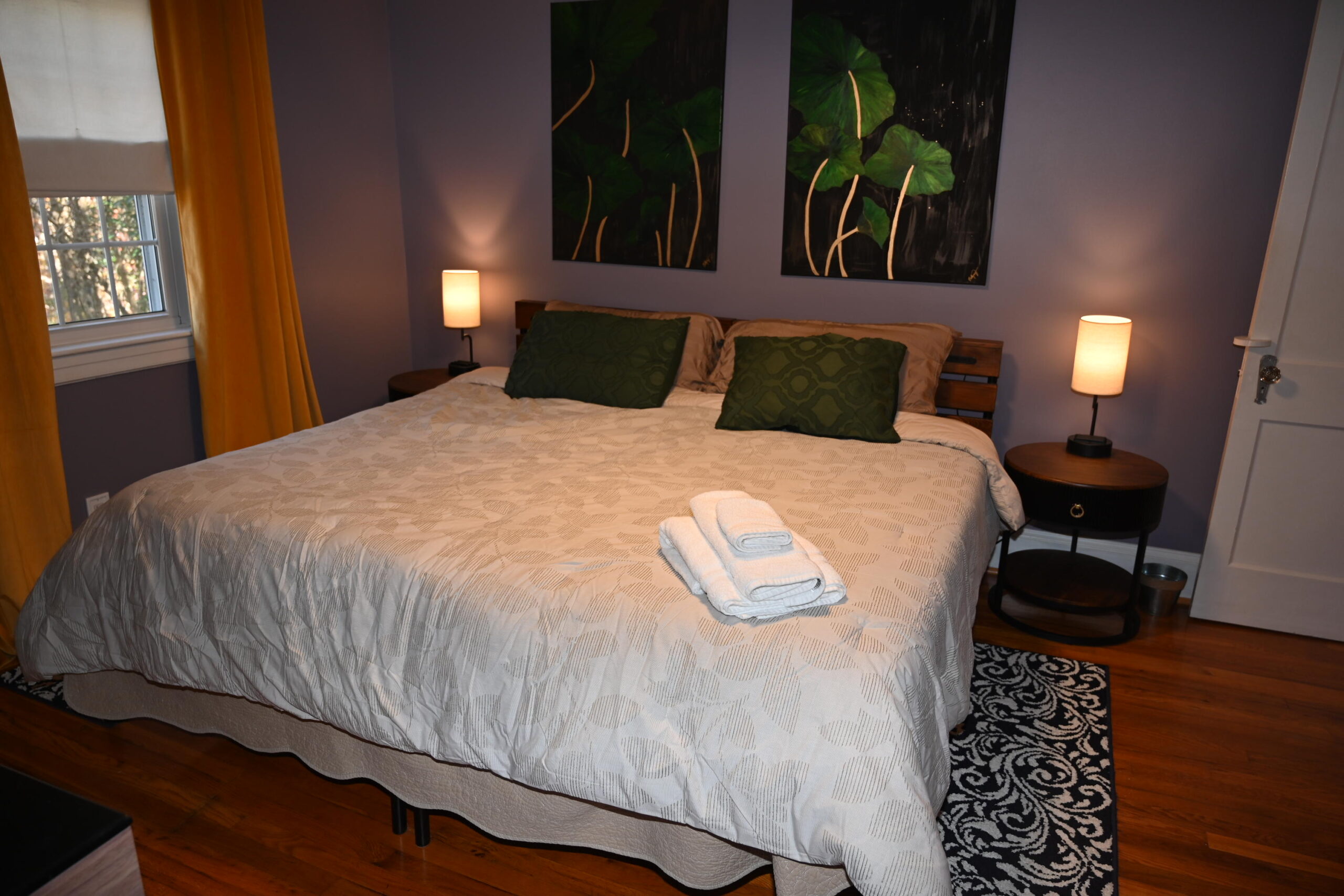 Description: $2050 7 night max Den with seating and 55" TV. Kitchen and sunroom. Bedroom 2 with QUEEN bed. Bedroom 3 with DOUBLE bed. Bathroom in the Hall. Upper Level Bedroom 1 with KING or TWO TWINS beds, private bathroom. Homeowner has added blackout curtains. Deck with seating.