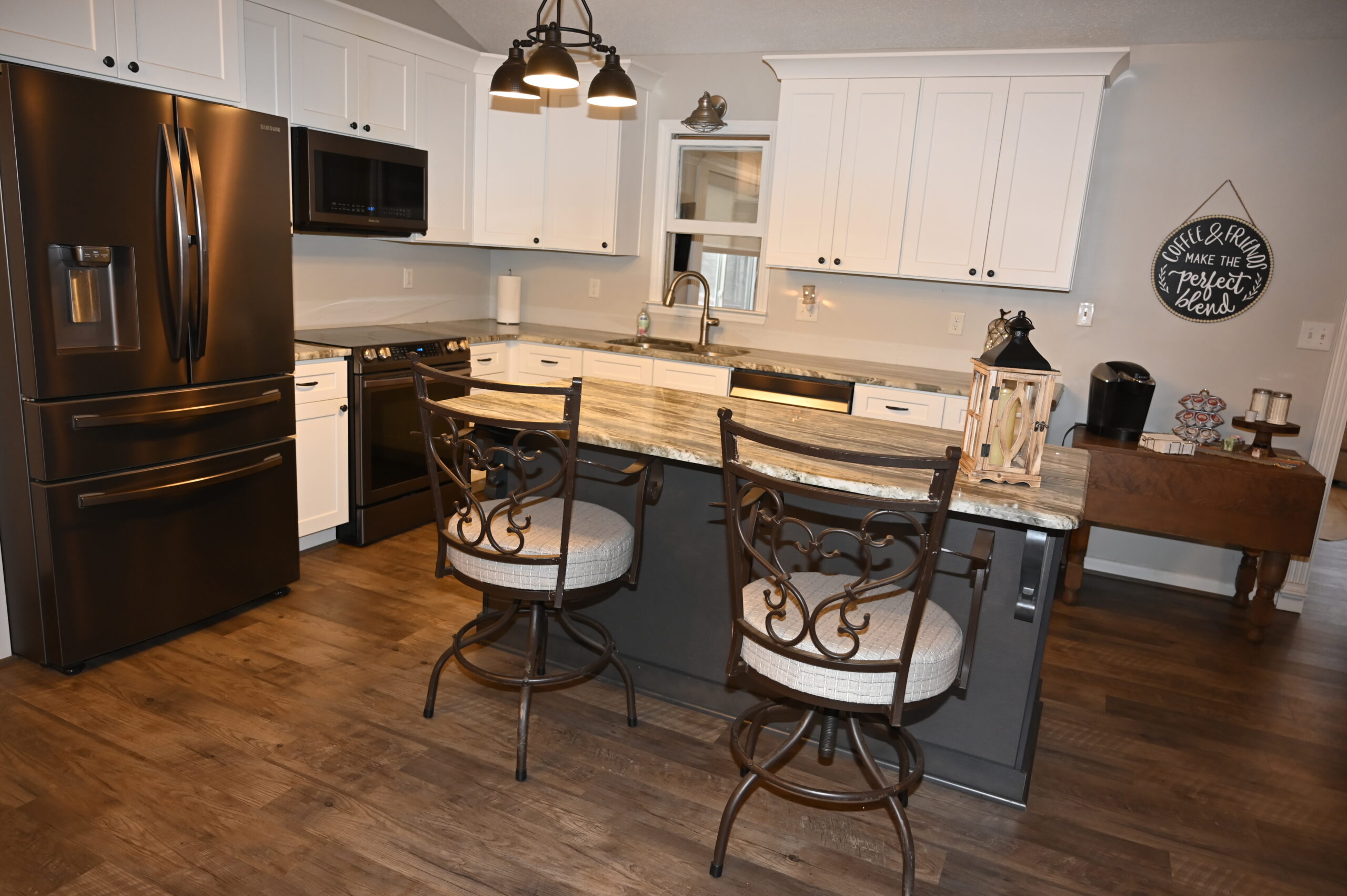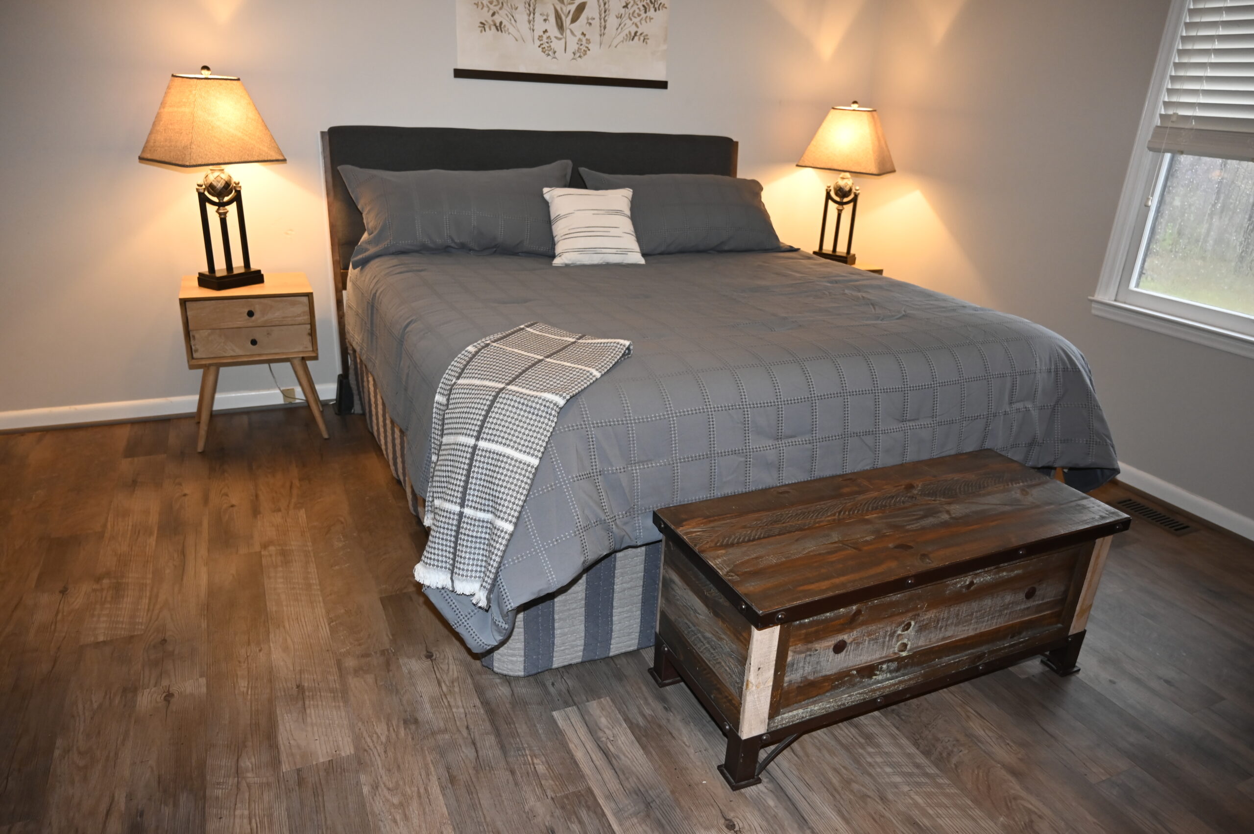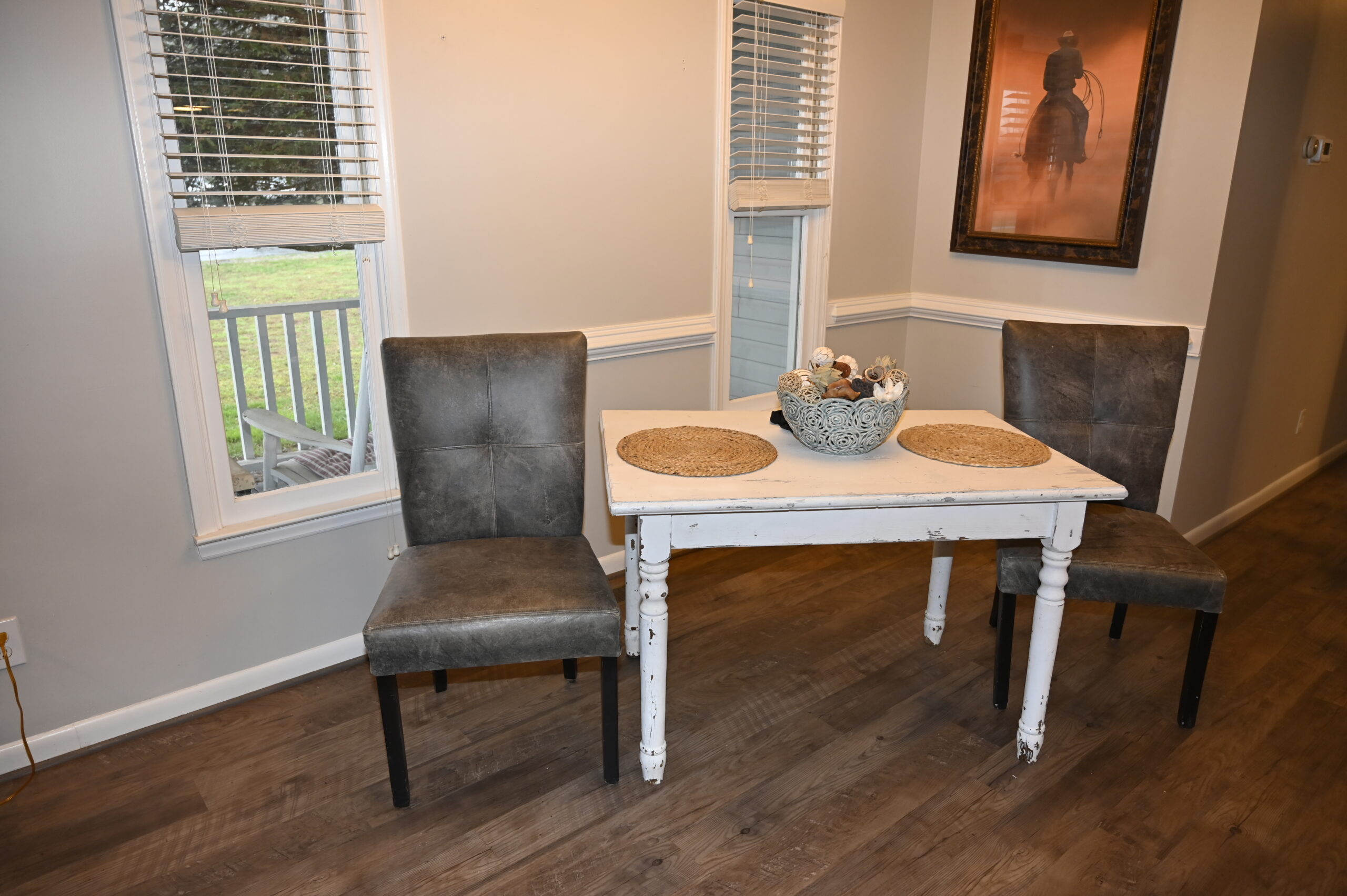 Description: $2450 One Level home. Den has loveseat and chair, 65"TV. Kitchen with bar seating and small dining area. Dining room. Primary Bedroom has KING bed, 32"TV. Full private bath. Bedroom 2 has QUEEN bed, 32"TV. Bedroom 3 has QUEEN bed, 32"TV. Full bath in hall. Patio with grill seating.