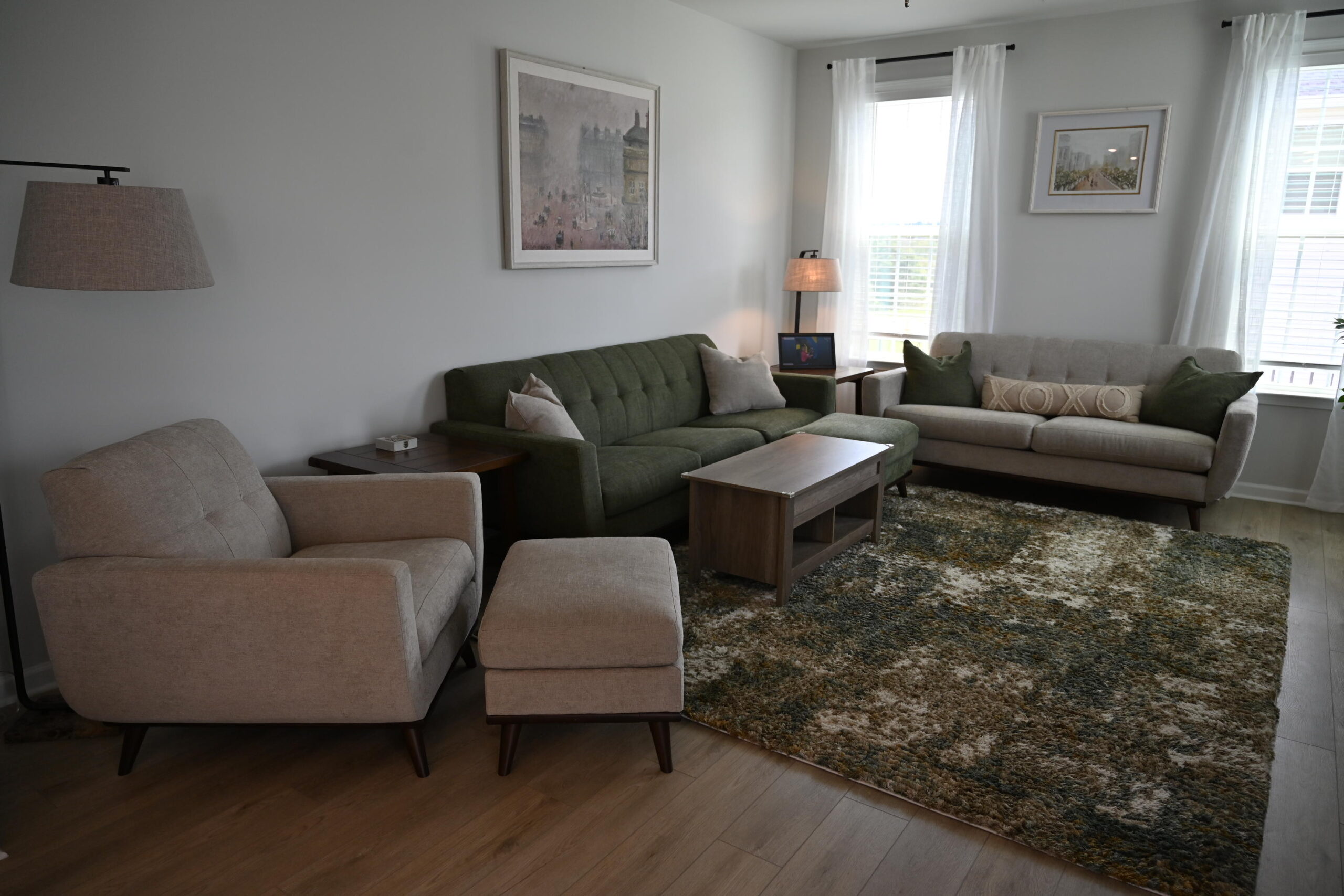 Description: $2550 Main level has den with 2 sofas, chair with ottoman and 65"TV. Kitchen with coffee bar with bar seating and dining area. Dining Room. Half bath. Patio with seating. Upper level has Primary Bedroom with KING bed, 55"TV. Full private bath. Bedroom 2 has QUEEN bed, 42"TV. Bedroom 3 has TWIN DAYBED that with Trundle creates a KING bed. Full bath in hall.