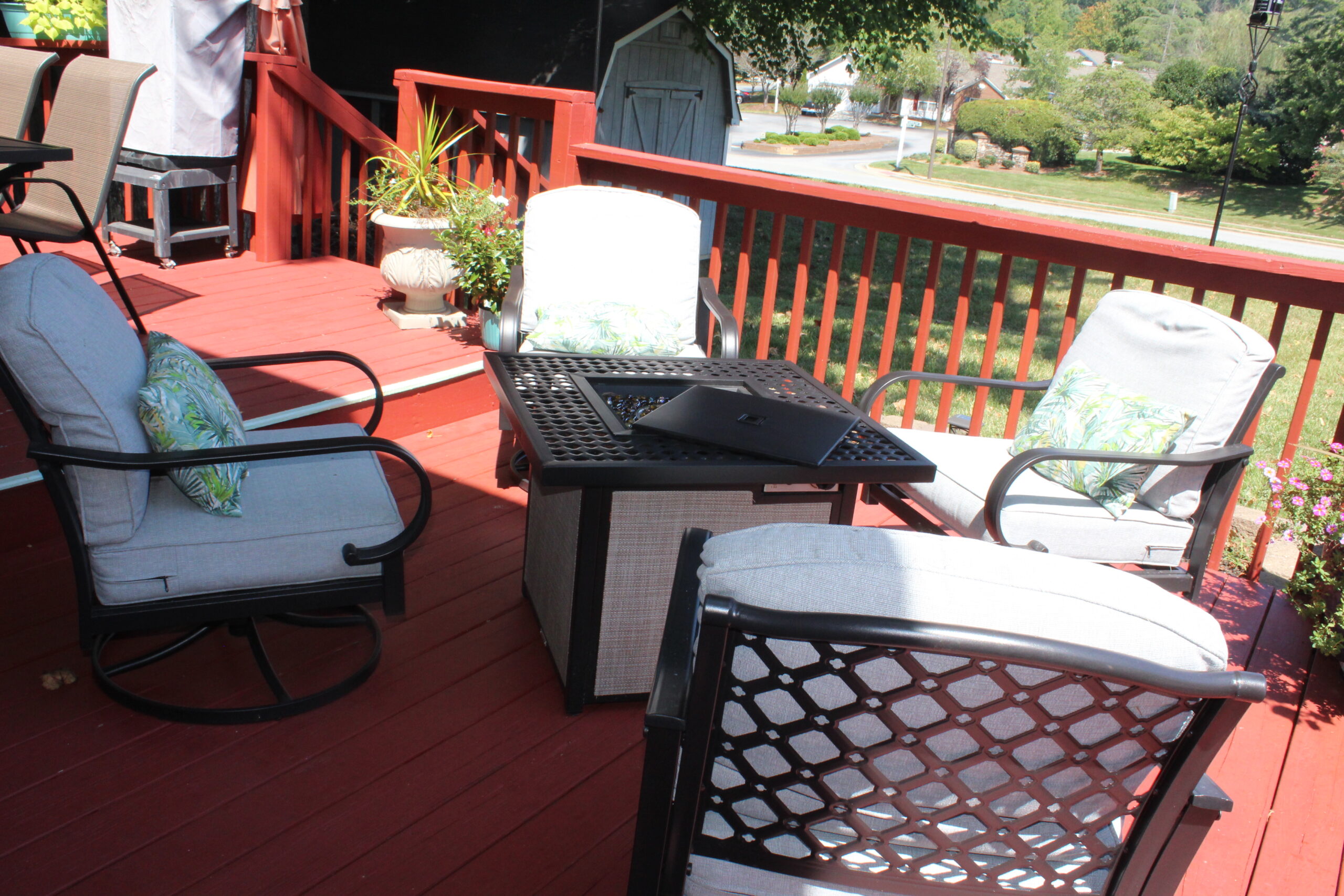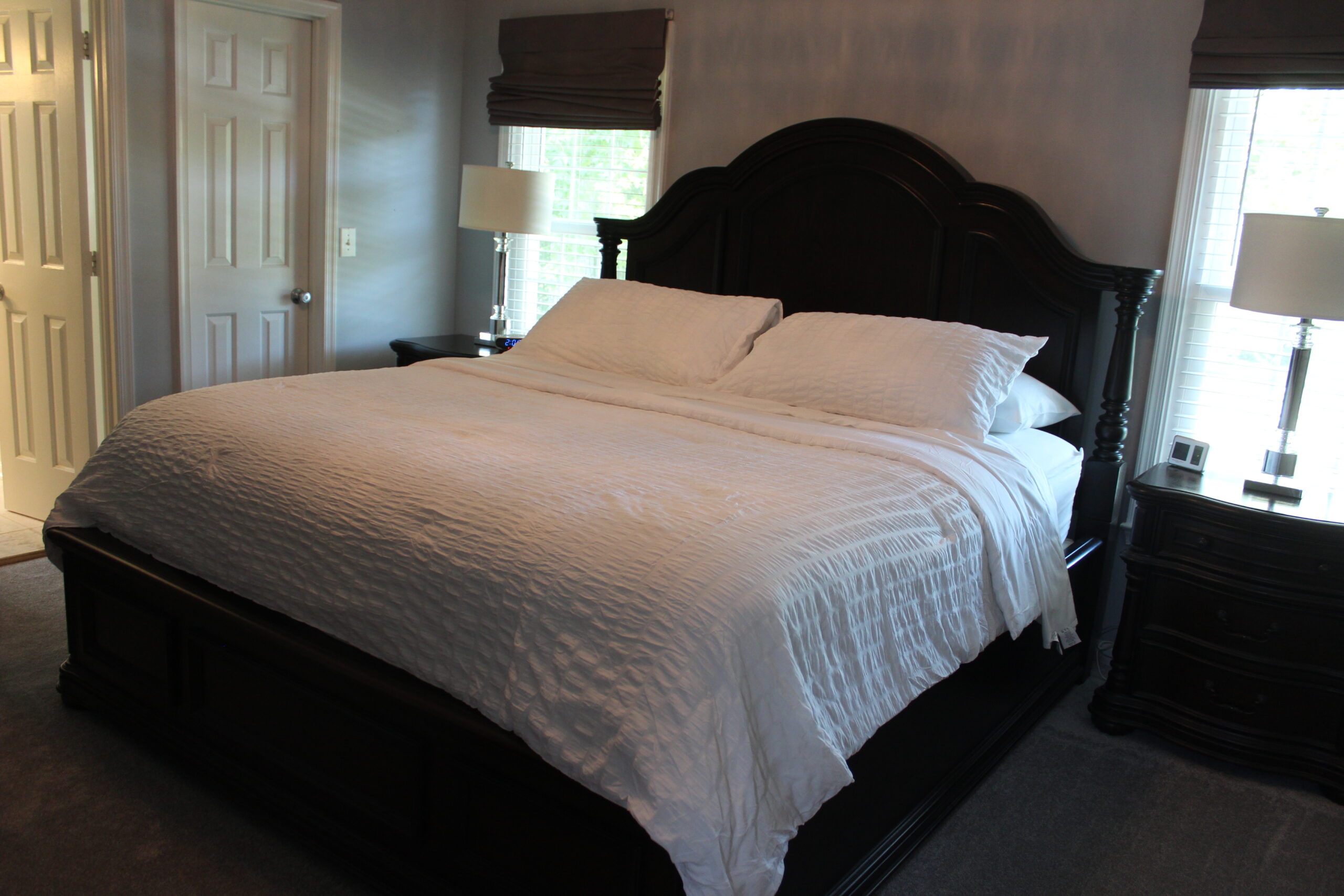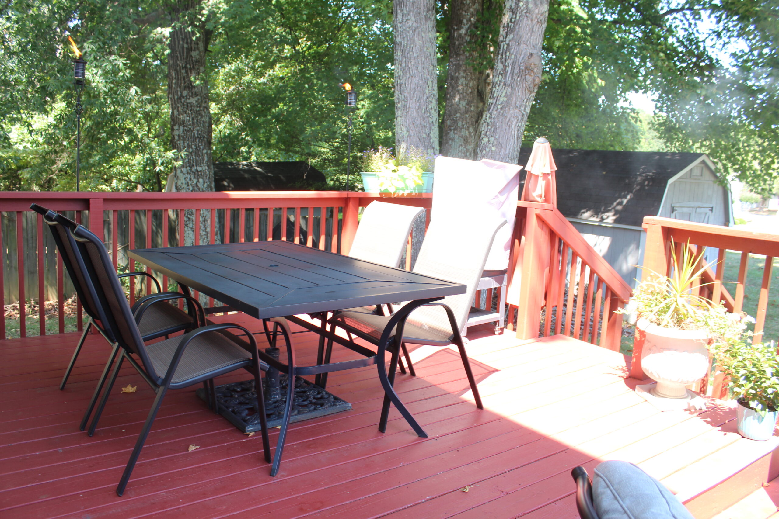 Description: $3325 Den with 60" TV, living room, kitchen, dining room, half bathroom. Deck and patio with seating, firepit, and grills. All bedrooms on the second floor. Primary bedroom with KING bed, 47" TV, private bathroom. Bedroom 2 with KING bed, 55" TV. Bedroom 3 with QUEEN bed, 32" TV. Bedroom 4 with QUEEN bed, 50" TV. Shared bathroom in hallway.