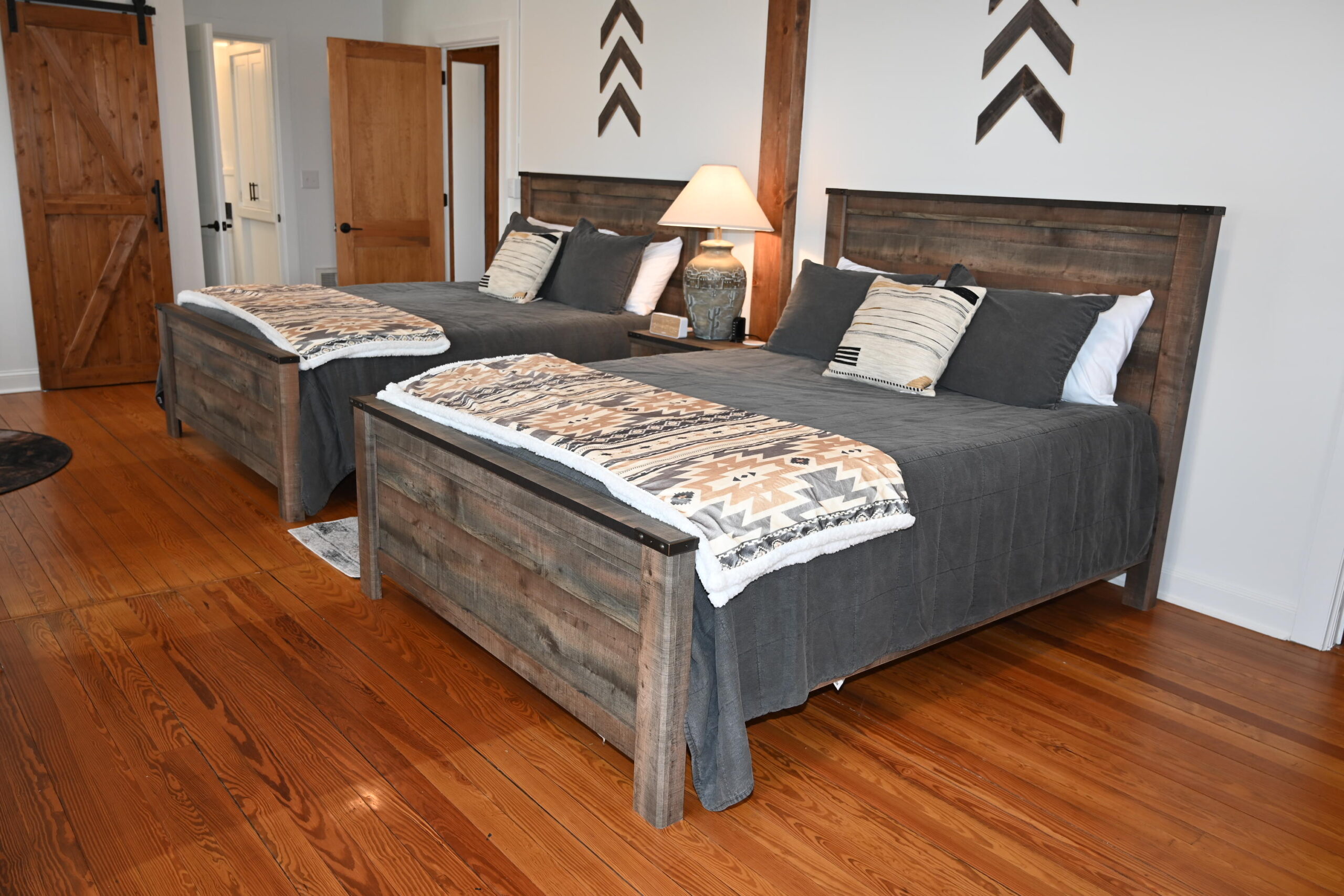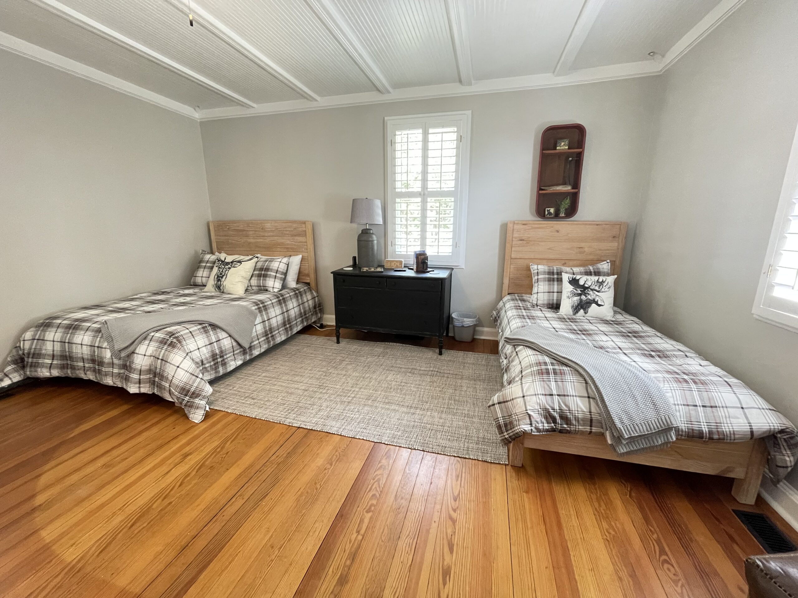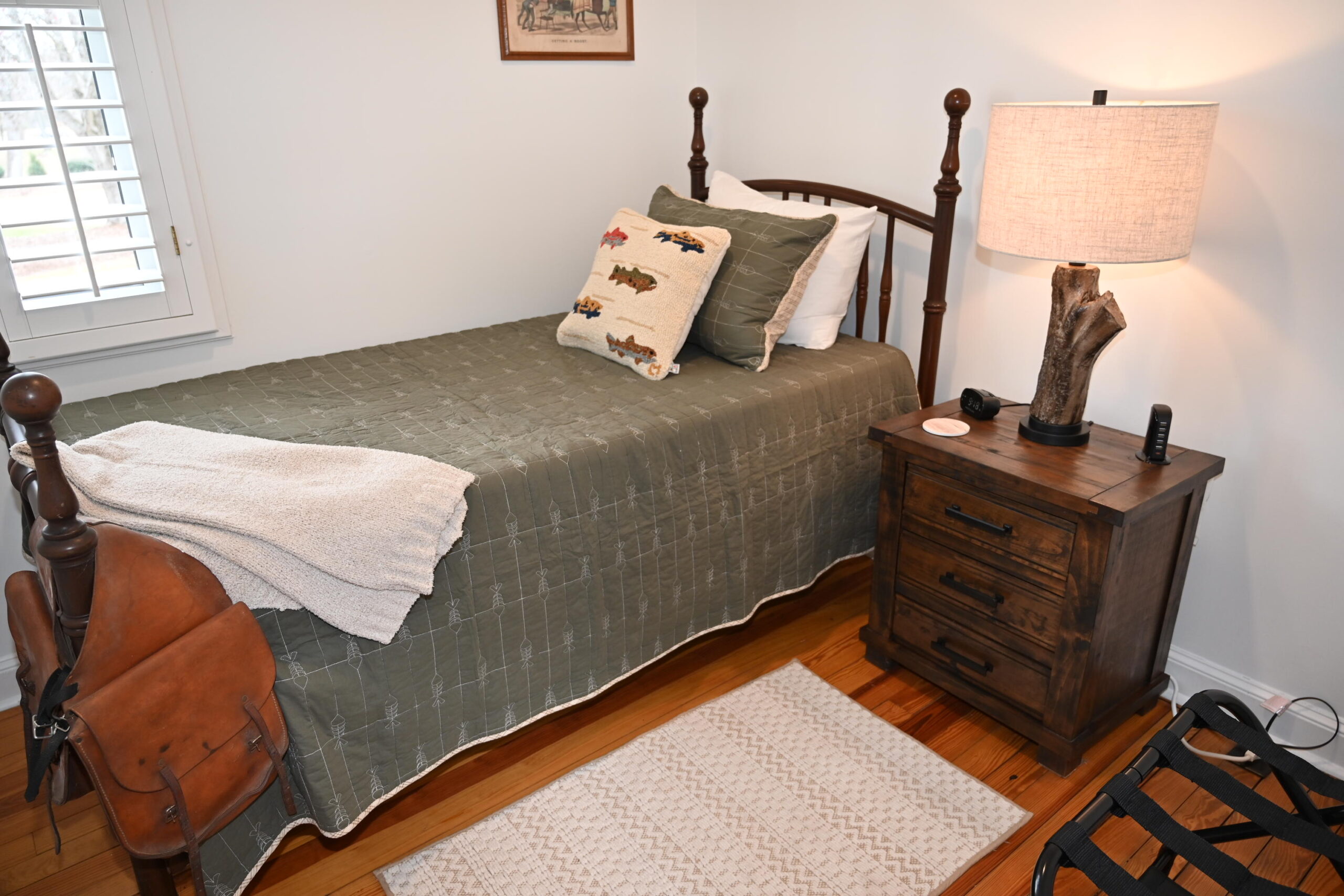 Description: $4225 Renovated home located on beautiful farm property. One level home with den, living room with 40" TV, bonus room, sunroom, and kitchen. Patio with seating and gas grill. Primary bedroom has TWO QUEEN beds, 42" TV, private bathroom. Bedroom 2 has QUEEN bed, 42" TV. Bedroom 3 has DOUBLE bed and a TWIN bed. Bathroom between bedrooms 2 and 3. Bedroom 4 has TWIN bed. Bedroom 5 has TWIN bed. Bathroom in the hall.