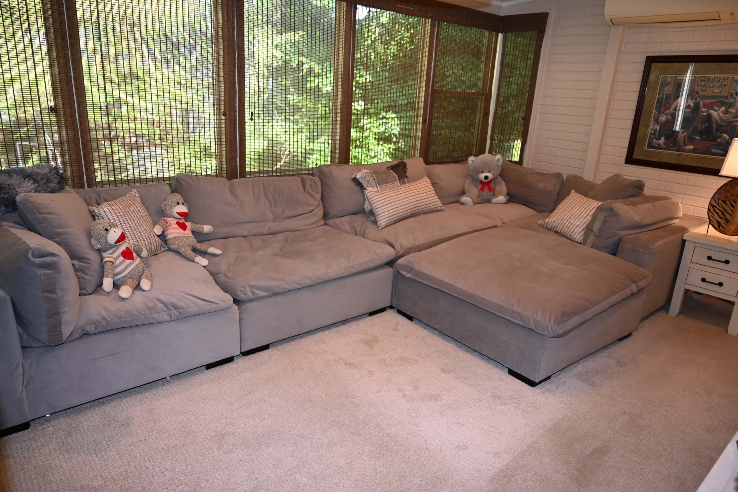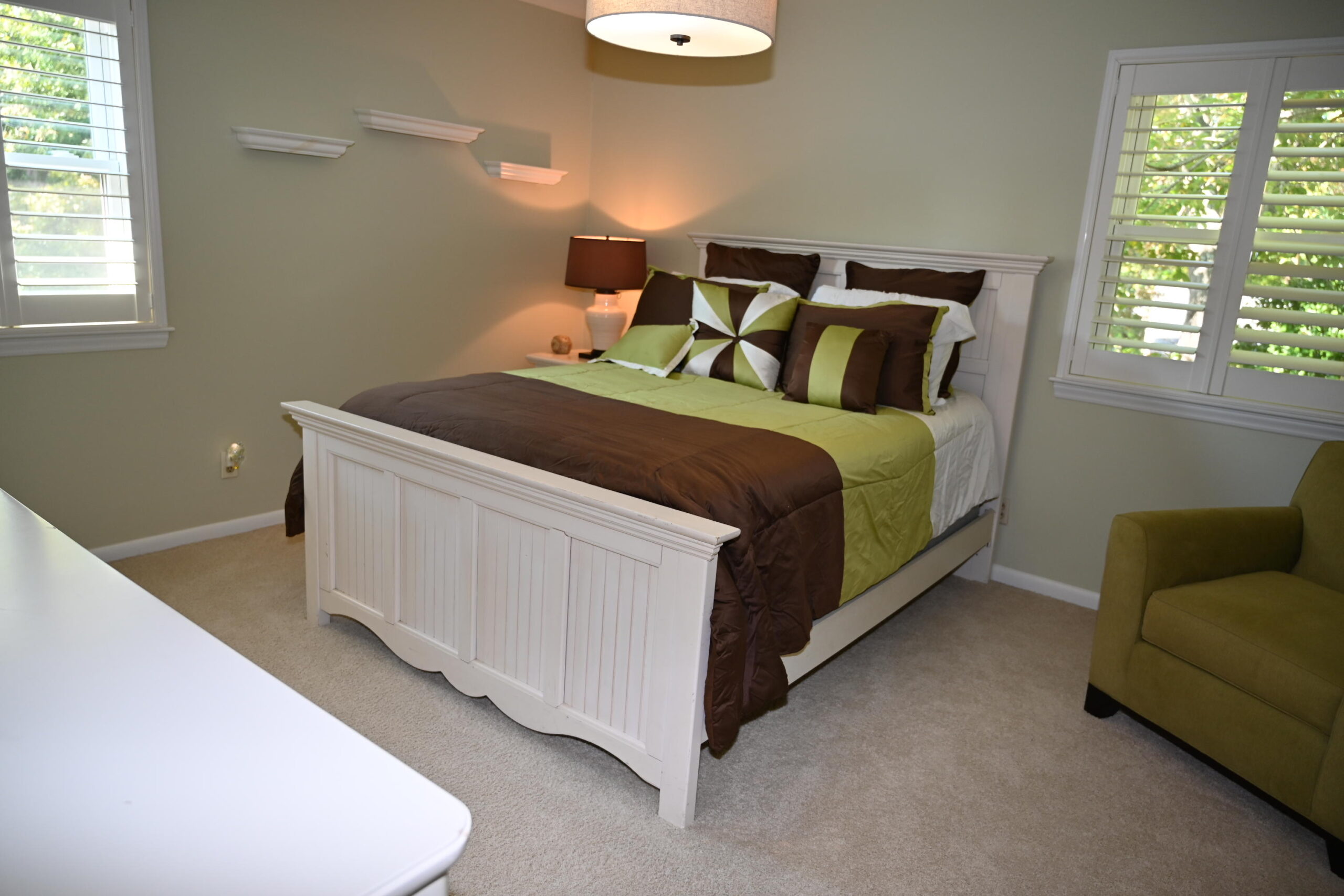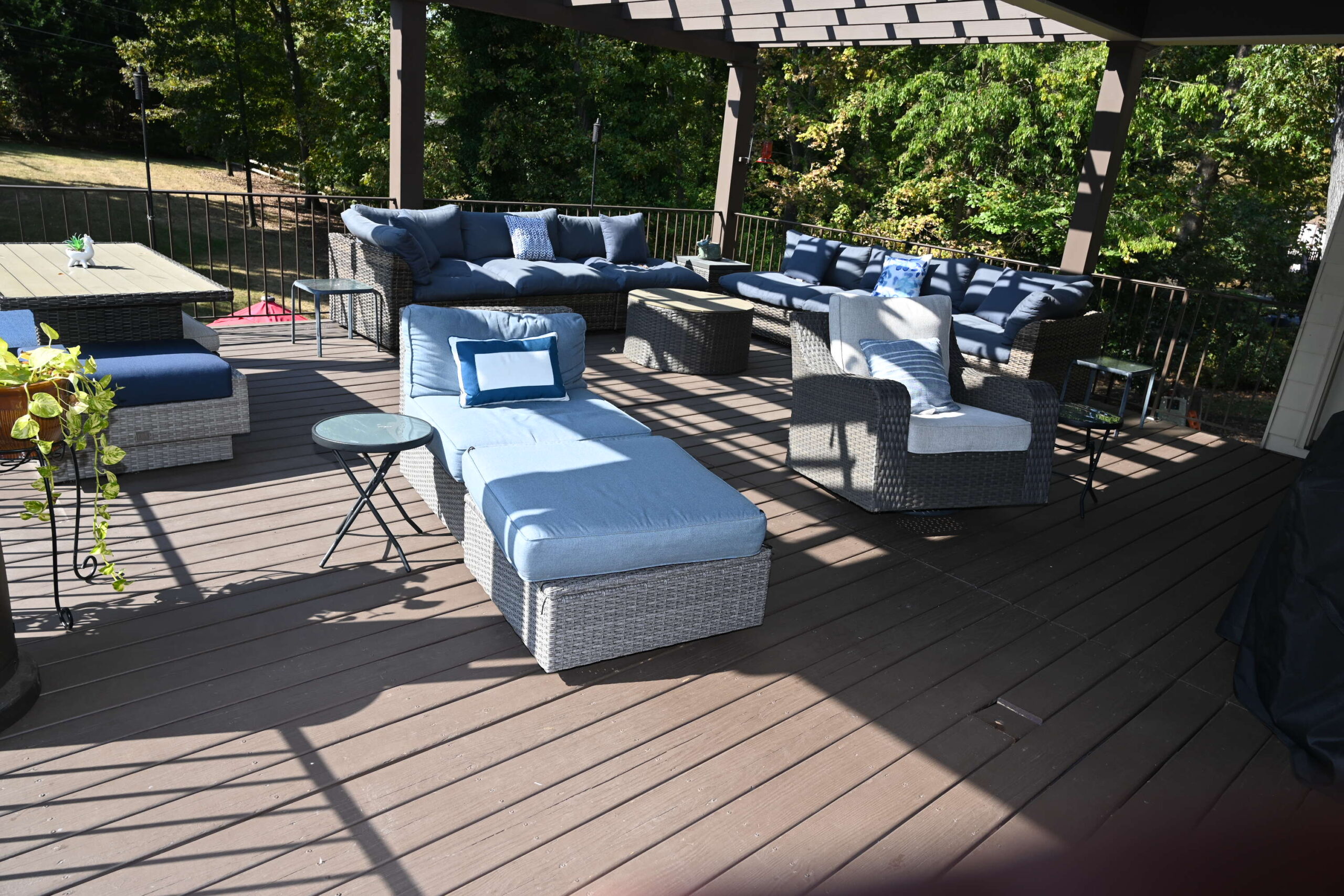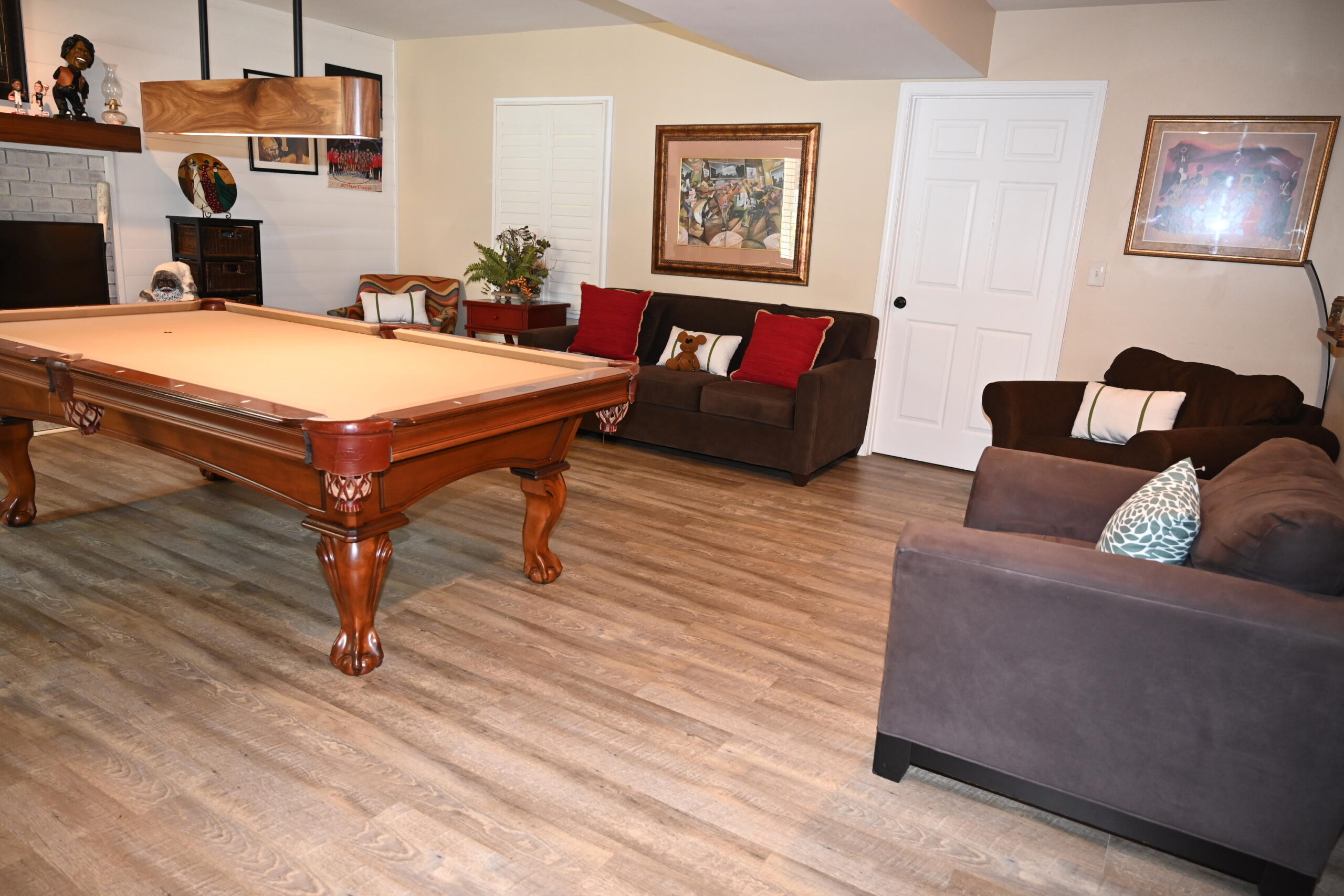 Lower Level has bedroom 6 with QUEEN bed, 55"TV. Full bath in hall. Den with sofa, 2 chairs, 42"TV & 48"TV. Game table. Kitchen and bar seating. Patio with seating.